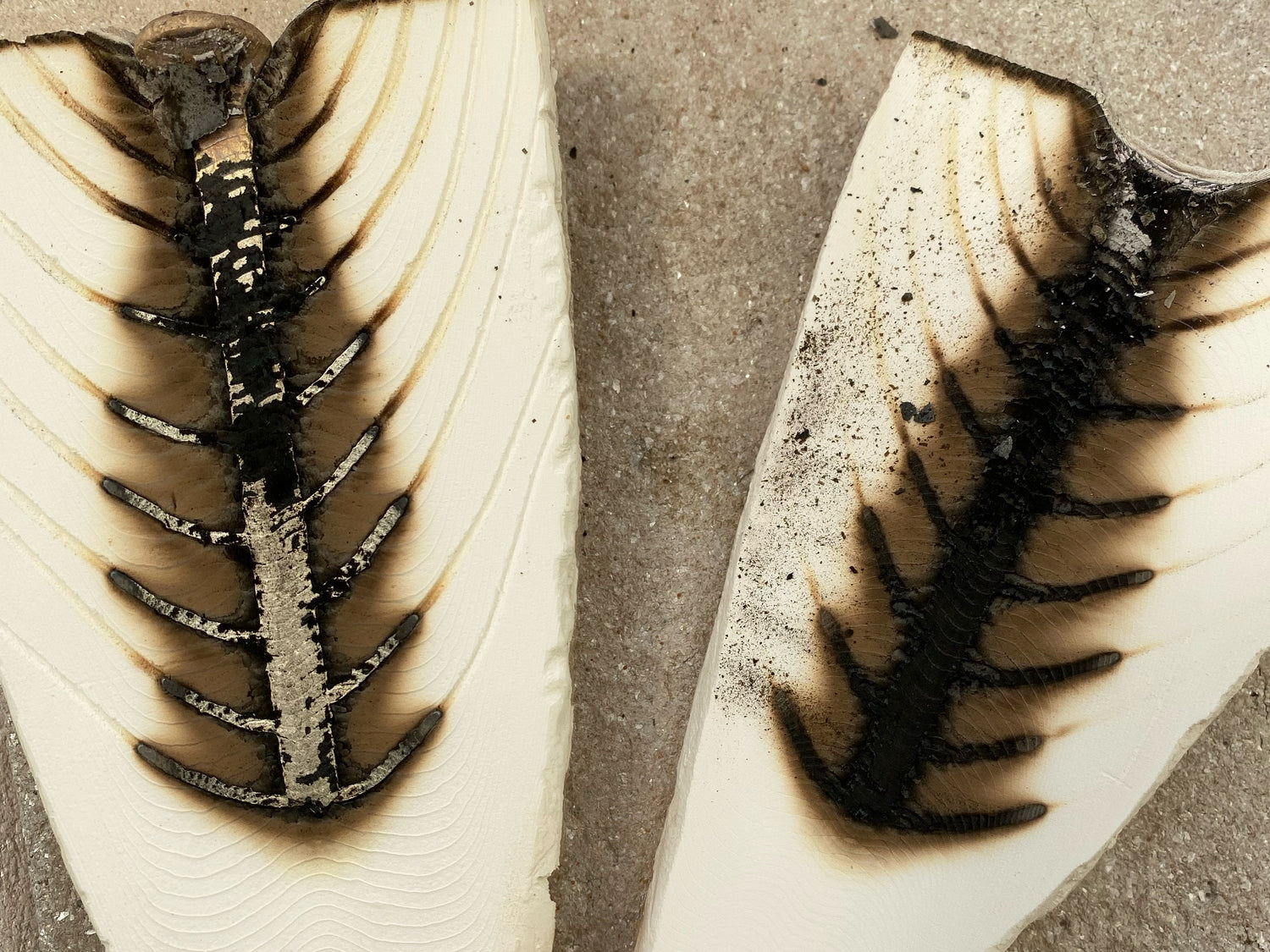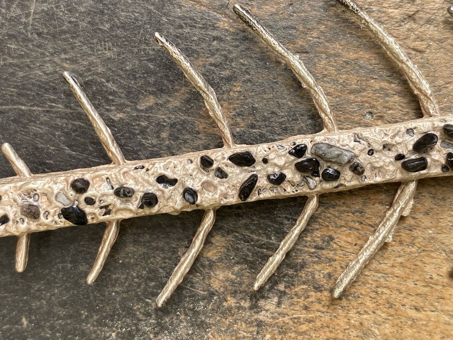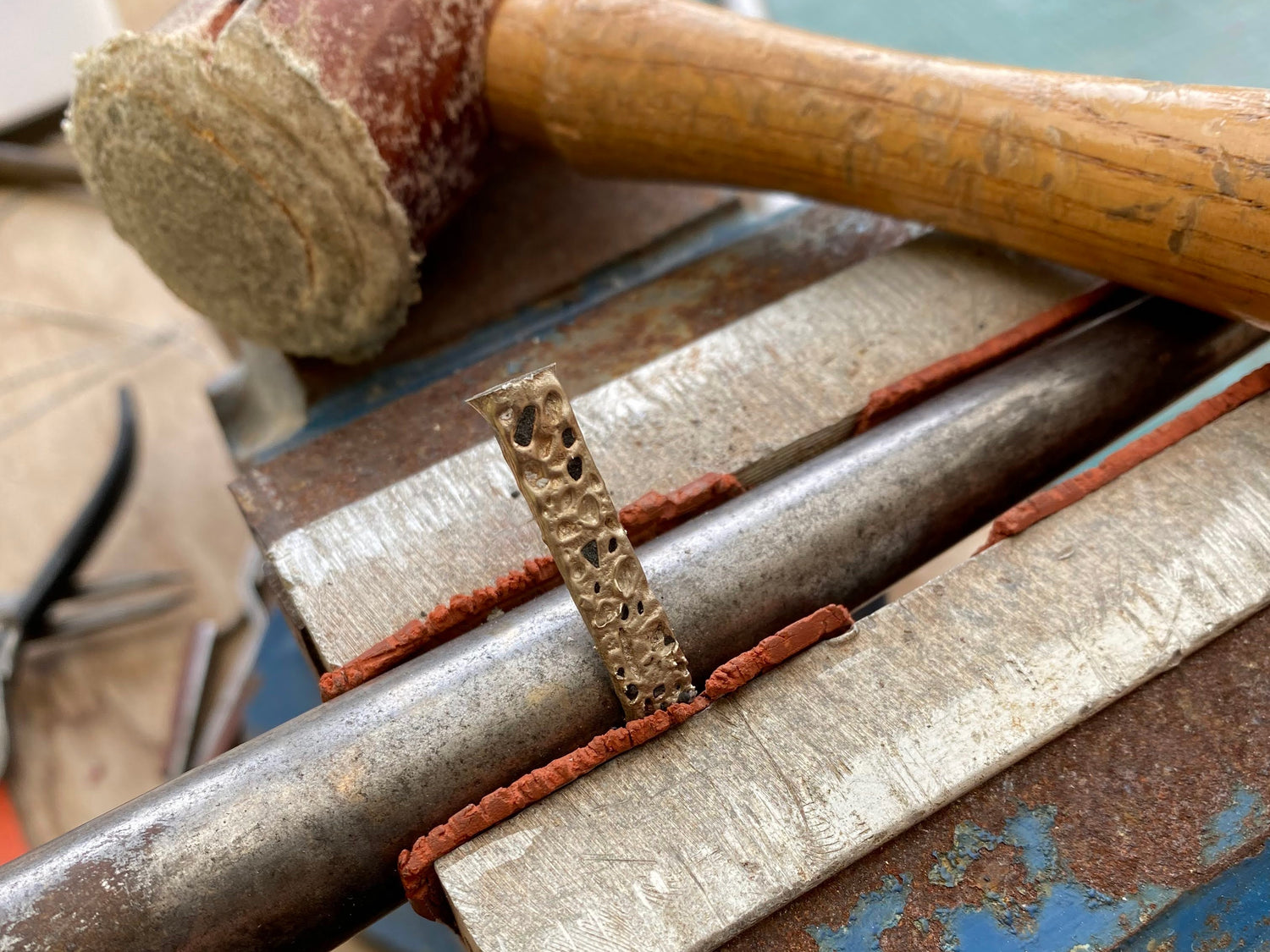 I then melt the chosen metal type and pour it into the mould, before apprehensively (it doesn't always work!) opening the mould to see how it has cast. You only get one shot at this type of casting, as the cuttlefish bone can only withstand the temperature of the molten metal for a single casting. So if it is not successful I have to start over, making a new cuttlefish bone mould from scratch.