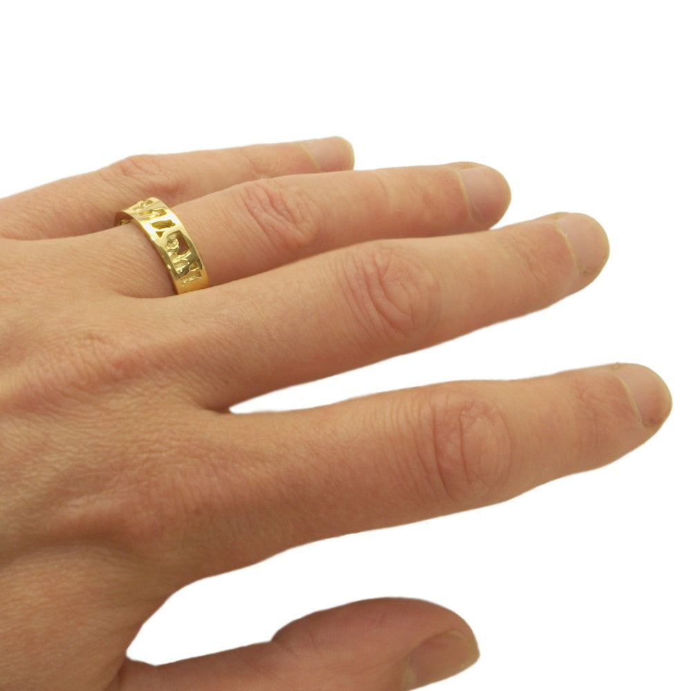 Handcrafted in solid 14ct yellow gold, and hallmarked. The ring width is 6mm by approximately 2mm thick. Highly polished as standard, but also available in brushed matt on request. This item can also be engraved on the inside with a personal message of your choice.