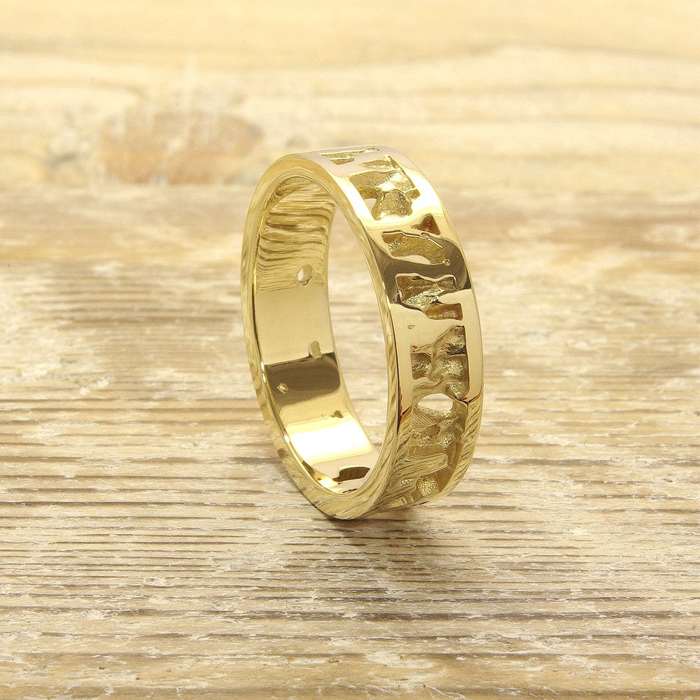 Cornish nautical UK handmade gold wedding ring created in Cornwall by designer Joseph Lamsin Jewellery; made using the sea from the Cornish coastline to organically shape and texture the unusual design.