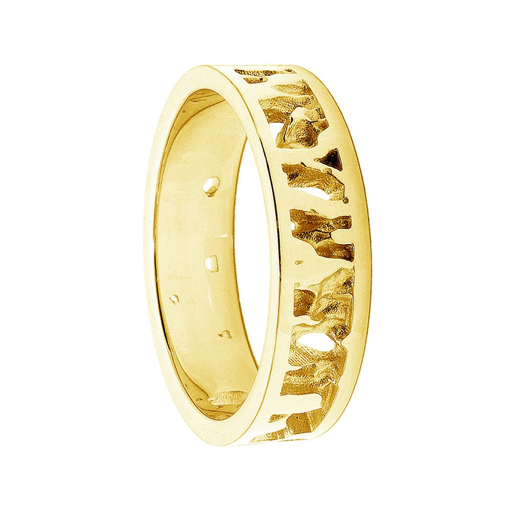 Handcrafted in solid 9ct yellow gold, and hallmarked. The ring width is 6mm by approximately 2mm thick. Highly polished as standard, but also available in brushed matt on request. This item can also be engraved on the inside with a personal message of your choice.