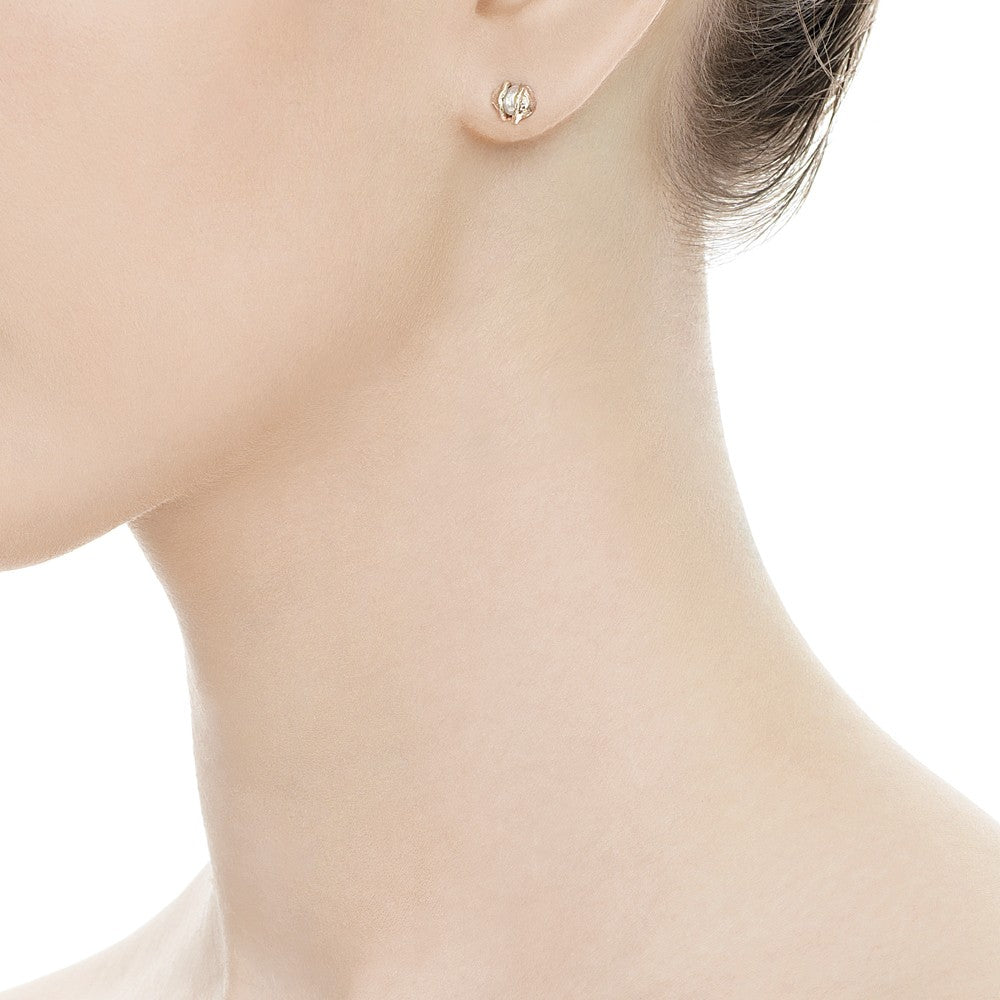 Small encased designer pearl stud earrings created in Cornwall by Joseph Lamsin Jewellery; made using the sea to organically shape and texture the design.