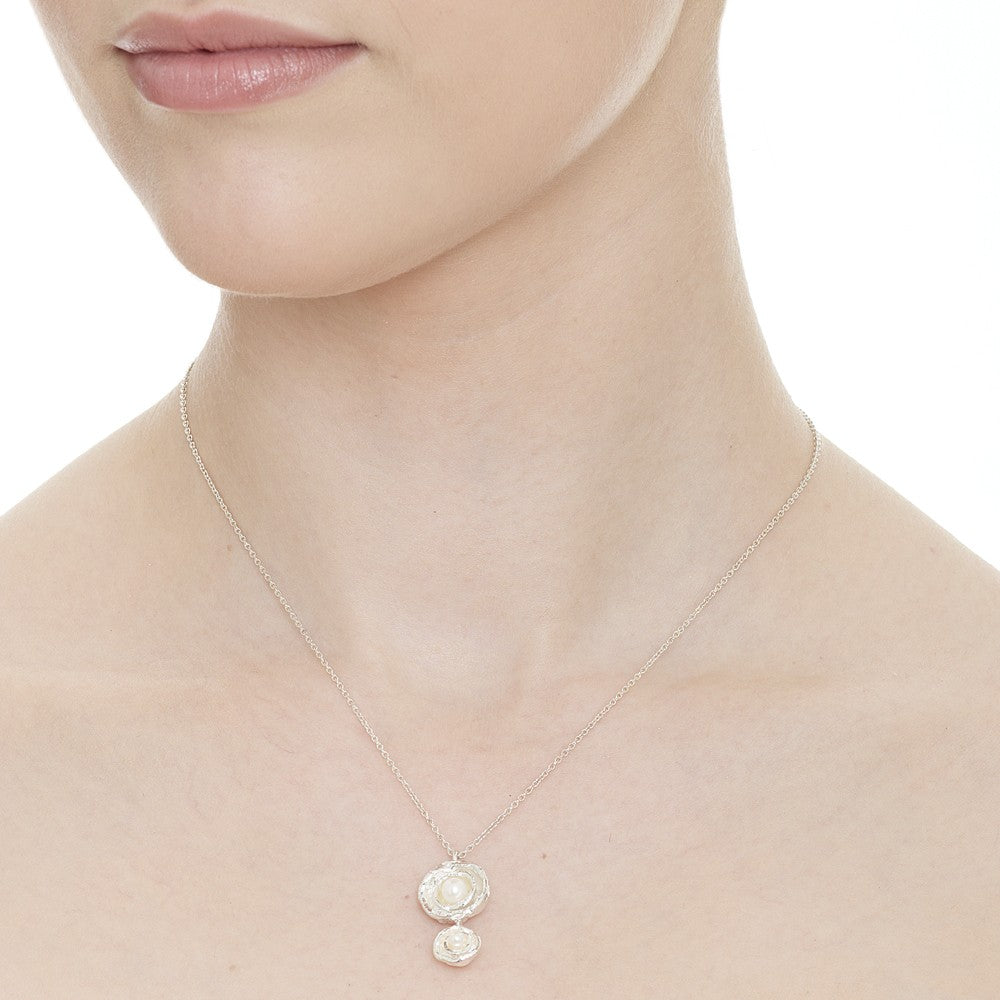 Double cup drop designer pearl necklace created in Cornwall by Joseph Lamsin Jewellery; made using the sea to organically shape and texture the design.